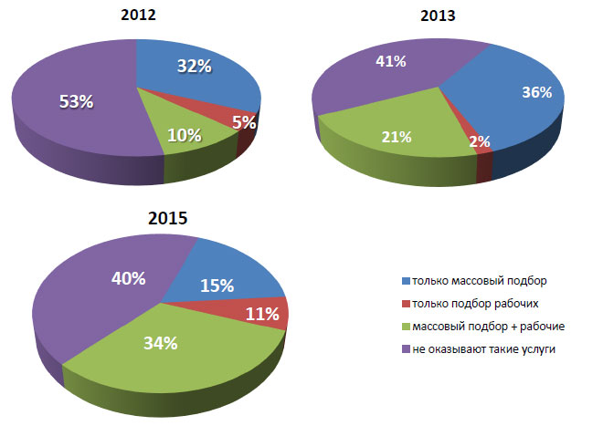 За два года с рынка рекрутинговых услуг ушло два федеральных кадровых агентства. Значительно уменьшилось количество региональных компаний. В основной массе закрылись молодые агентства (до 3 лет), а также часть компаний переориентировали свой бизнес с подбора персонала на другие смежные сферы, например, его обучение, графологию и т.п.